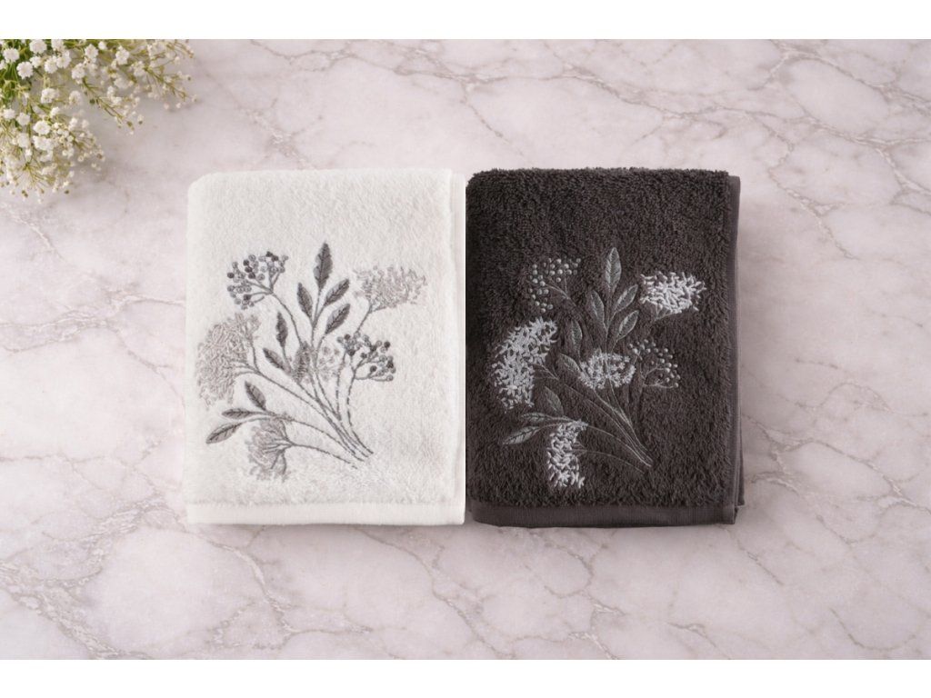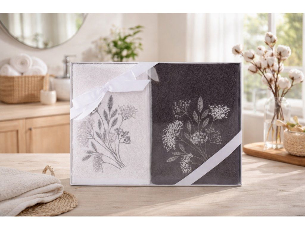 Set má nadýchaný vzhľad a je veľmi hebký na dotyk s vysokou savosťou. Tematická výšivka na spodnej časti výrobku dotvára elegantný vzhľad. Set obsahuje 2 uteráky. Je zabalený v efektných krabičkách.
