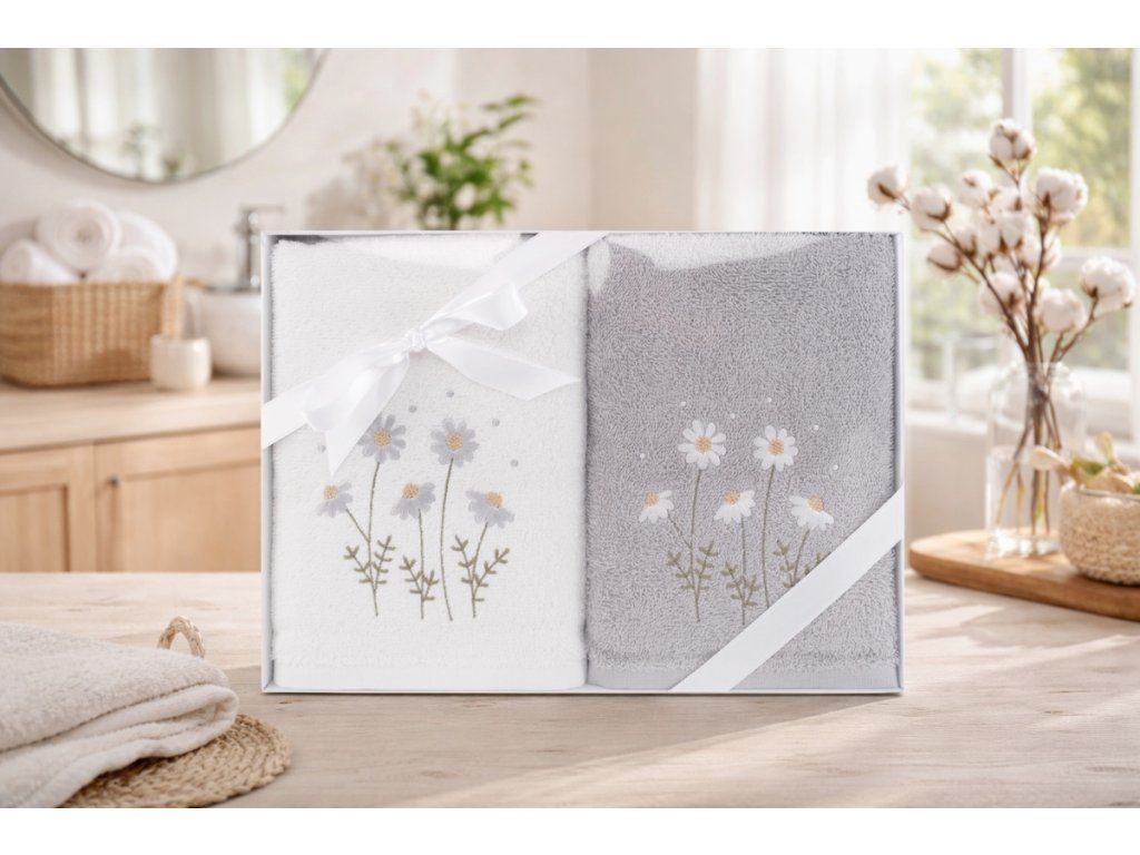 Set má nadýchaný vzhľad a je veľmi hebký na dotyk s vysokou savosťou. Tematická výšivka na spodnej časti výrobku dotvára elegantný vzhľad. Set obsahuje 2 uteráky. Je zabalený v efektných krabičkách.