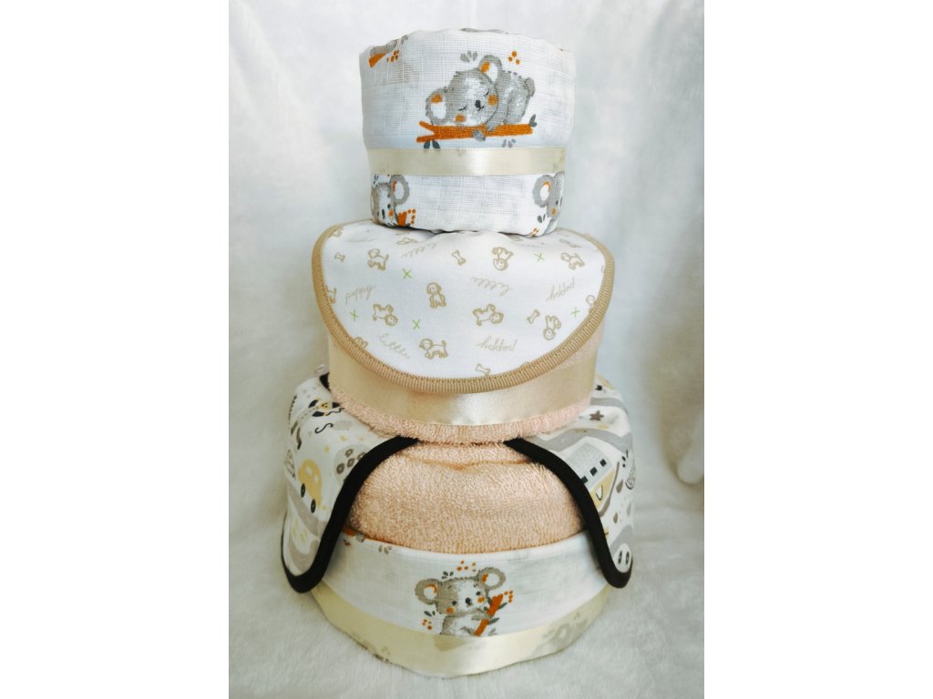Torta obsahuje: 2 ks osuška Ema 70x140 cm, 3 ks detský podbradník KIKO, 5 ks plienka 70x70 s potlačou + dekorácia a aranžovanie (môžu sa meniť podľa aktuálnej ponuky).