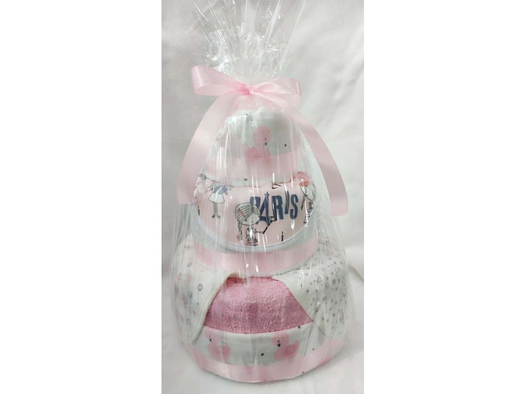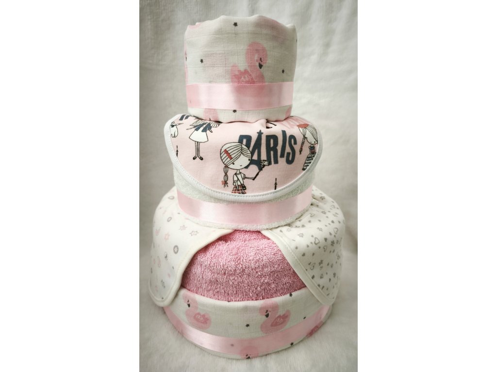 Torta obsahuje: 2 ks osuška Ema 70x140 cm, 3 ks detský podbradník KIKO, 5 ks plienka 70x70 s potlačou + dekorácia a aranžovanie (môžu sa meniť podľa aktuálnej ponuky).